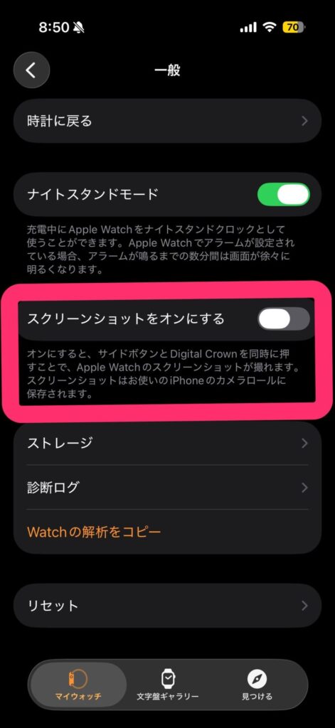 このスイッチをオンにすることで、Apple Watchでのスクリーンショット撮影が可能になります。
