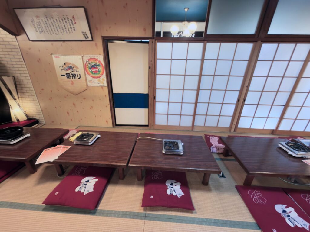 店内は畳に座布団、そして卓上ガスコンロが並ぶ、まさに「日本の食卓」といった雰囲気。今回は、看板メニューである「下仁田ポーク」の豚すき焼きセット2人前と、喉を潤す瓶ビールを注文しました。