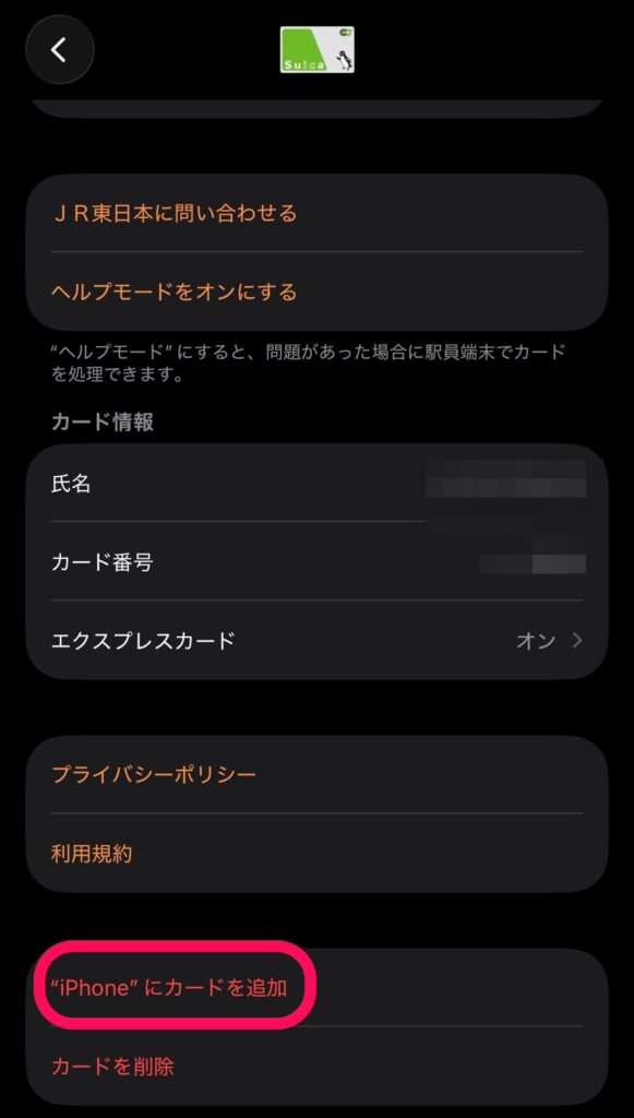 詳細画面の一番下にある「“iPhone”にカードを追加」をタップします。