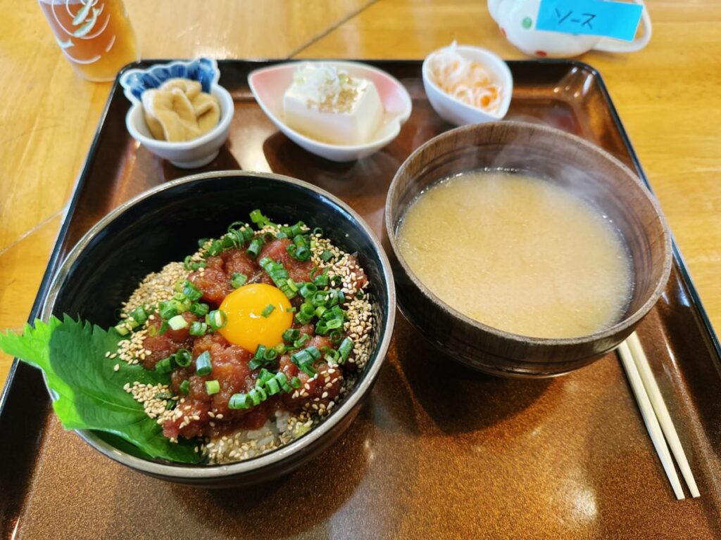 私は迷わず孤独のグルメにも登場したまぐろユッケどんぶりとメンチカツにしました。