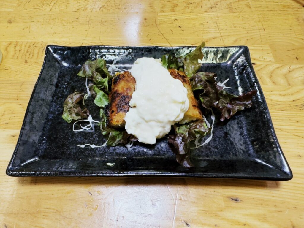 このコースには先付け2種、芋まんじゅうバター焼き、カジキマグロの黄金揚げ、茶碗蒸し、もずく、俵にぎり(お抹茶、ゆかり)と続きました。