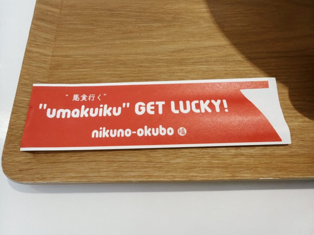 割り箸の包み紙には、馬のイラストと共に「”umaikuiku” GET LUCKY!」や「The delicious horse meat which You can find happiness」といった、縁起の良いユニークなメッセージが書かれていたのも楽しいですね。