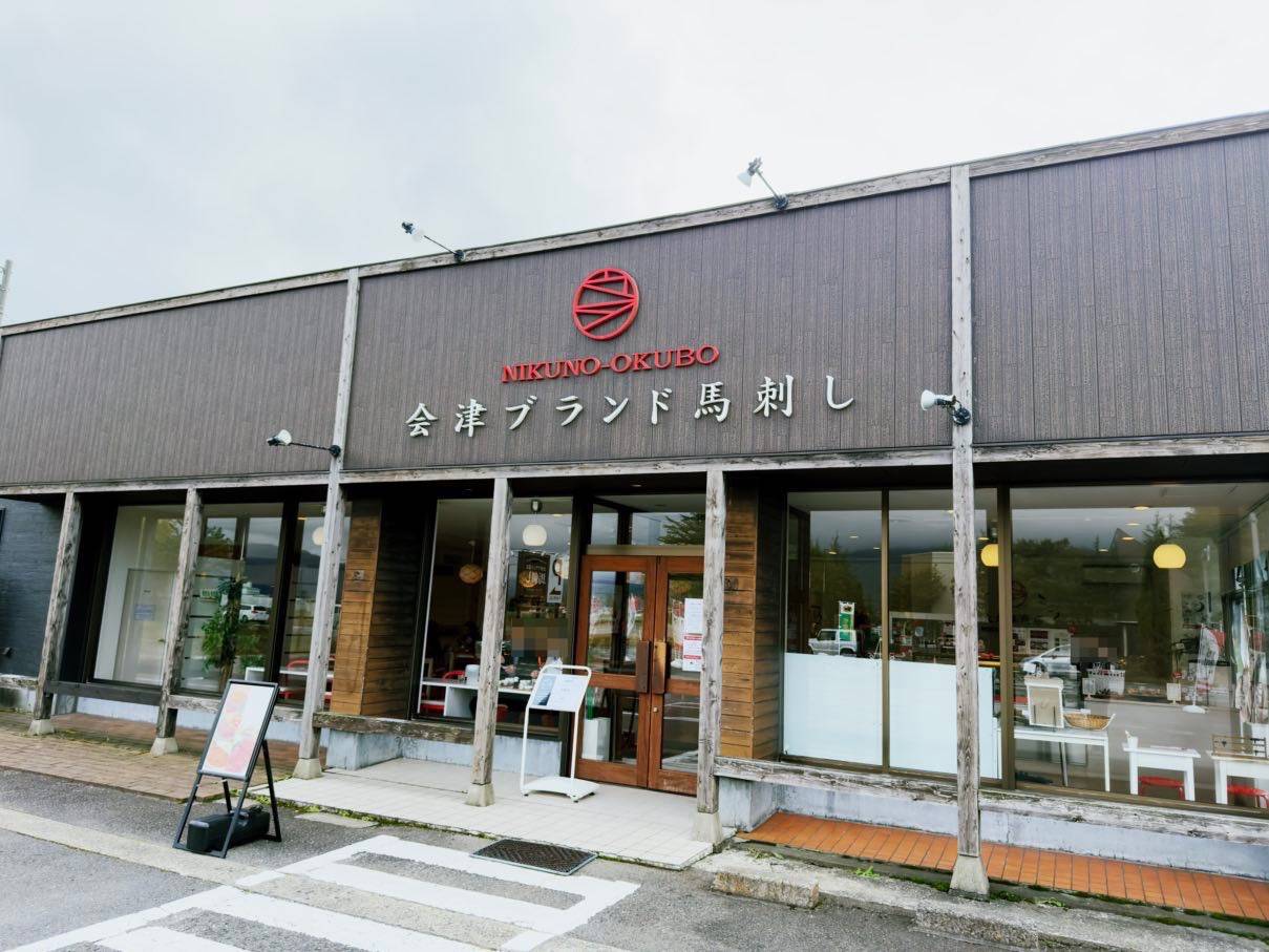 外観は、木目を基調とした落ち着いたたたずまいで、「NIKUNO-OKUBO 会津ブランド馬刺し」の文字が目立っています。