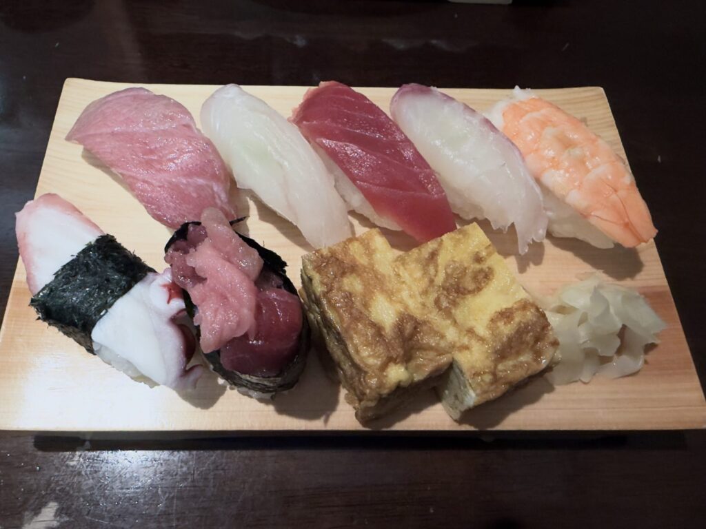 本鮪中トロ、活ヒラメ、本鮪赤身、マダイ、蒸し海老、浜ゆでタコ、本鮪中落ち、自家製玉子焼きのラインナップ。
