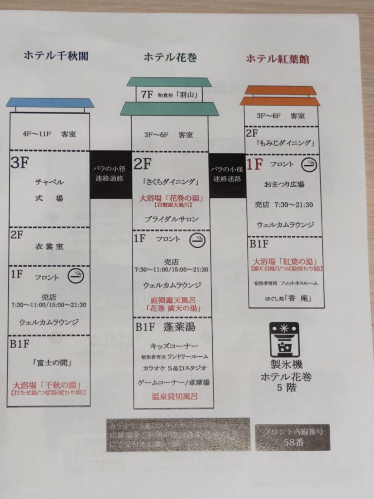 なんとこの施設はホテル千秋閣、ホテル花巻、ホテル紅葉館の3つの巨大なホテルが並んでおり、しかも中で繋がっています。