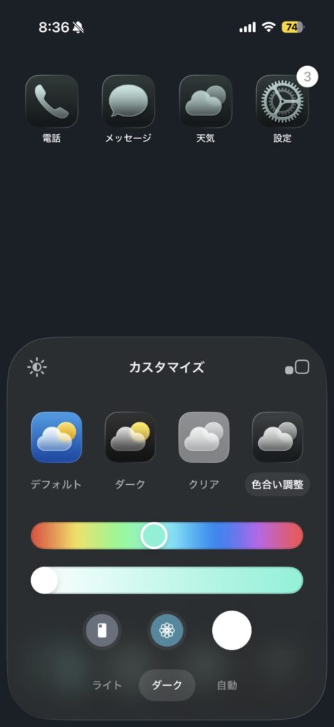 iPhoneのアプリアイコンをダークモードにするのも良いですが、同じくカスタマイズの中にある「クリア」や「色合い調整」もおすすめです。