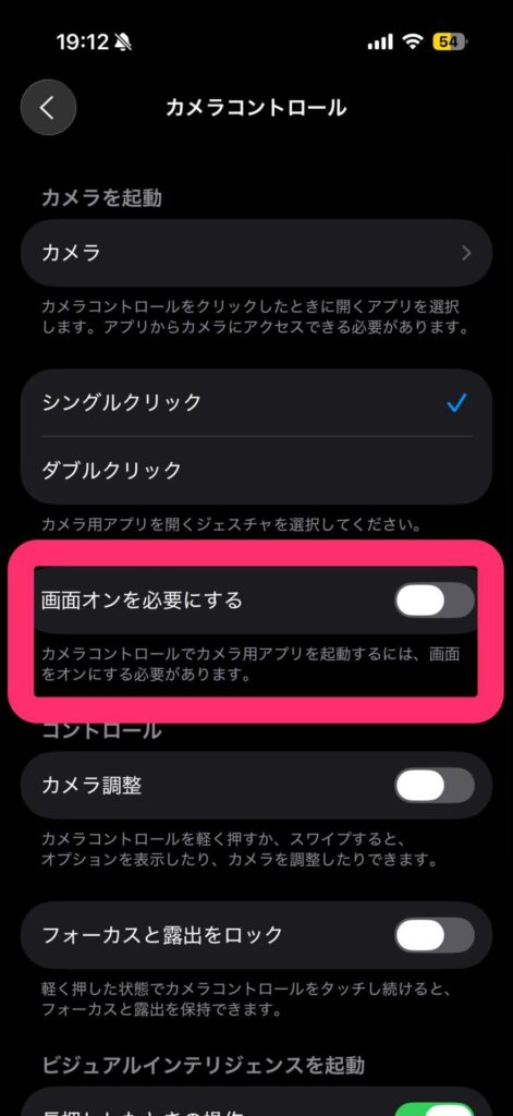 カメラコントロールの「画面オンを必要にする」という設定がオンになっていると、カメラコントロールでカメラアプリを起動するには、画面をオンにする必要があると書かれています。