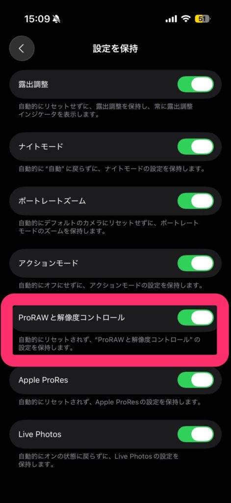 「ProRAWと解像度コントロール」のトグルをオン(緑色)にします。