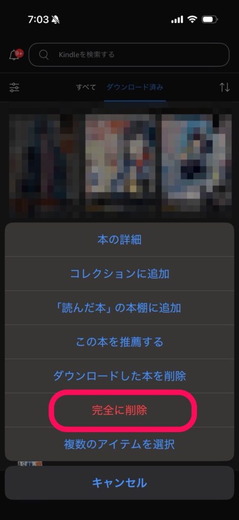 「ダウンロード済み」タブの中から対象の本を長押しし、青い文字で書かれた「ダウンロードした本を削除」を選べば、クラウドに本を残したまま、端末内のデータだけを安全に解放できます。基本的に、二度と読み返すことがないと断言できる本以外で「完全に削除」を使う場面はないと考えて間違いありません。