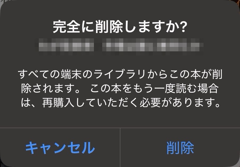 画像にある警告文にも「再購入していただく必要があります」と明記されている通り、誤って実行してしまった場合の救済措置はありません。読み終わった本が溜まって邪魔に感じる場合は、削除するのではなく、特定のフォルダにまとめる「コレクション機能」を活用するのが賢明です。