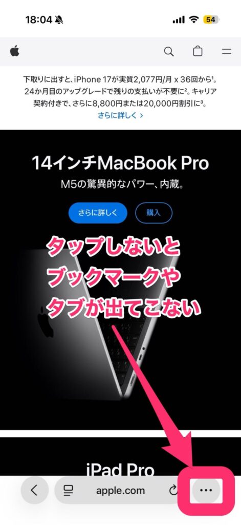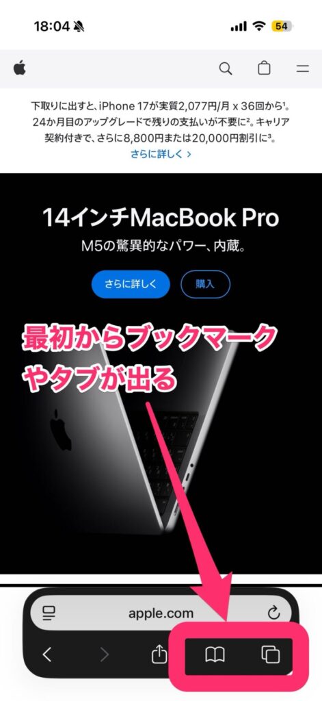 - 解決方法: iPhoneの「設定」アプリから、「Safari」へ進み、「タブ」の項目で**「コンパクト」から「下」に変更**することで、以前のようにタブバーにブックマークやタブボタンが常時表示されるようになり、すぐにアクセスできるようになります。