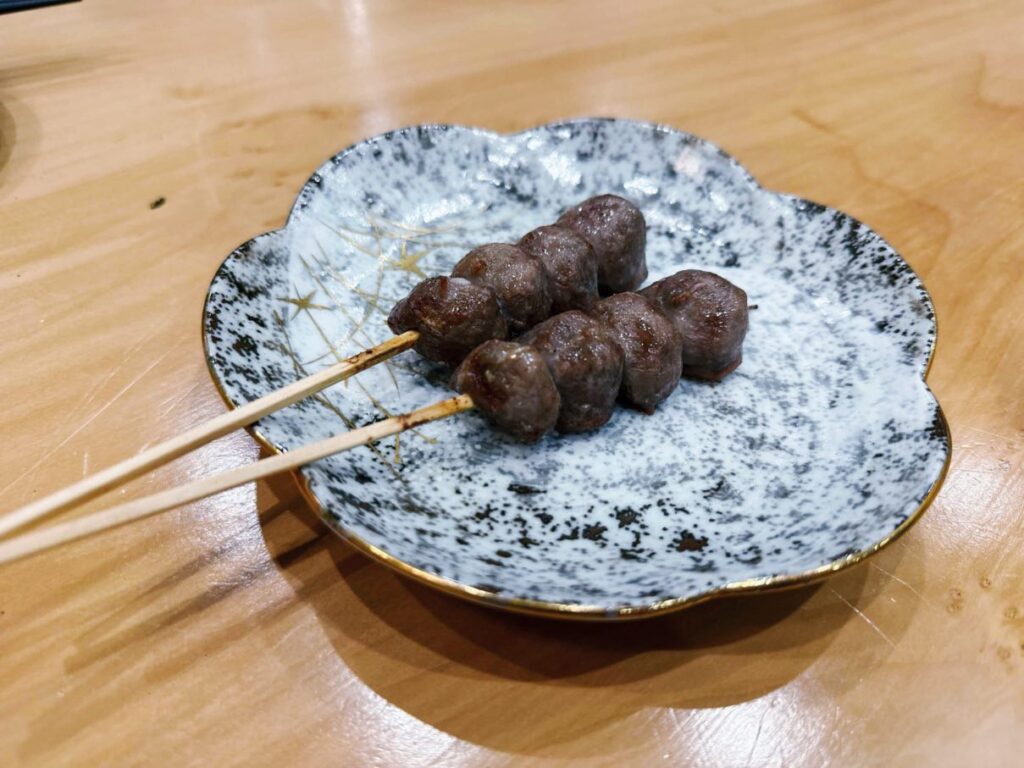 焼き鳥3種(砂肝、むね、ささみ)。香ばしく焼かれた砂肝や、ジューシーなむね肉、ささみの串焼きを堪能しました。