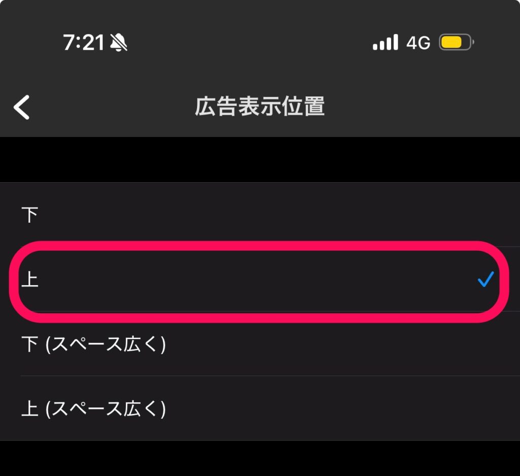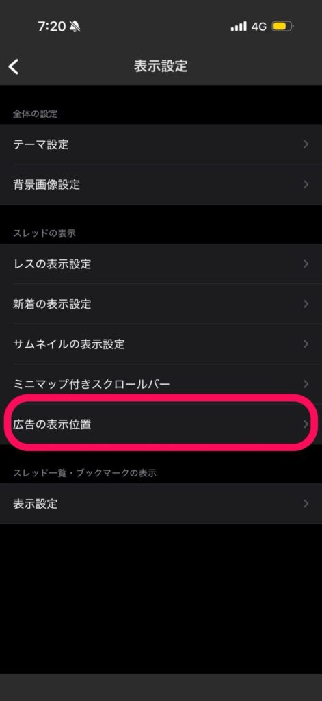 表示設定の画面を少し下にスクロールすると、「広告の表示位置」という項目が見つかるので、こちらをタップします。